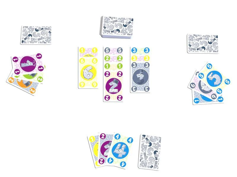 On a turn, a player plays 1-3 cards onto the table, and each card played must match at least one characteristic of the card on which it is being played. If a pile now has at least four cards in a row with a matching characteristic, e.g., four yellow number circles, that player claims all of the cards in that pile. A player refills their hand to three cards at the end of their turn.