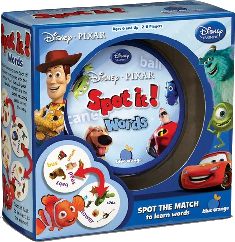 The popular Disney•Pixar cast invites you on a learning adventure! Kids will play with Lightening McQueen, Nemo, Wall•E, and all their favorite characters from the box-office hits and boost early reading skills by racing to spot matches between basic words and the corresponding pictures. Each card is decorated with a variety of images from the Disney•Pixar films, so the whole family will also have fun connecting an image to the movie it comes from! Between any two cards, there is always one match. Spot it first to win!