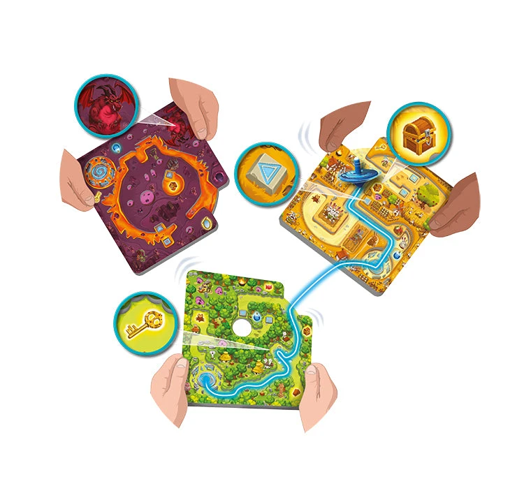 In the cooperative family game Ghost Adventure, players guide a spinning top across several game boards and must complete tasks on them to successfully complete missions. For each of the 56 missions, a different route must be completed with the spinning top. The double-sided boards show eight different worlds and a variety of goals to reach without stopping the spinning top (too often).