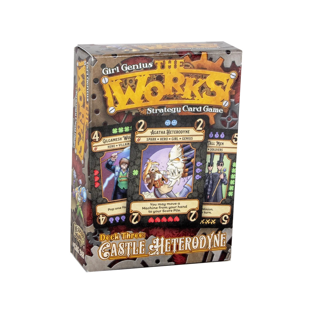 Girl Genius: The Works is a non-collectible card game that consists of several standalone decks of cards. You can play the game with any one of those decks, while also being able to combine some or all of those decks into a single deck for a longer game or a game with more players. Each deck contains many unique cards, but the gameplay is the same in all cases.