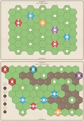 Includes: a 2 sided game board with maps of New England/Pittsburgh and Switzerland in the new Age of Steam: Deluxe graphic style