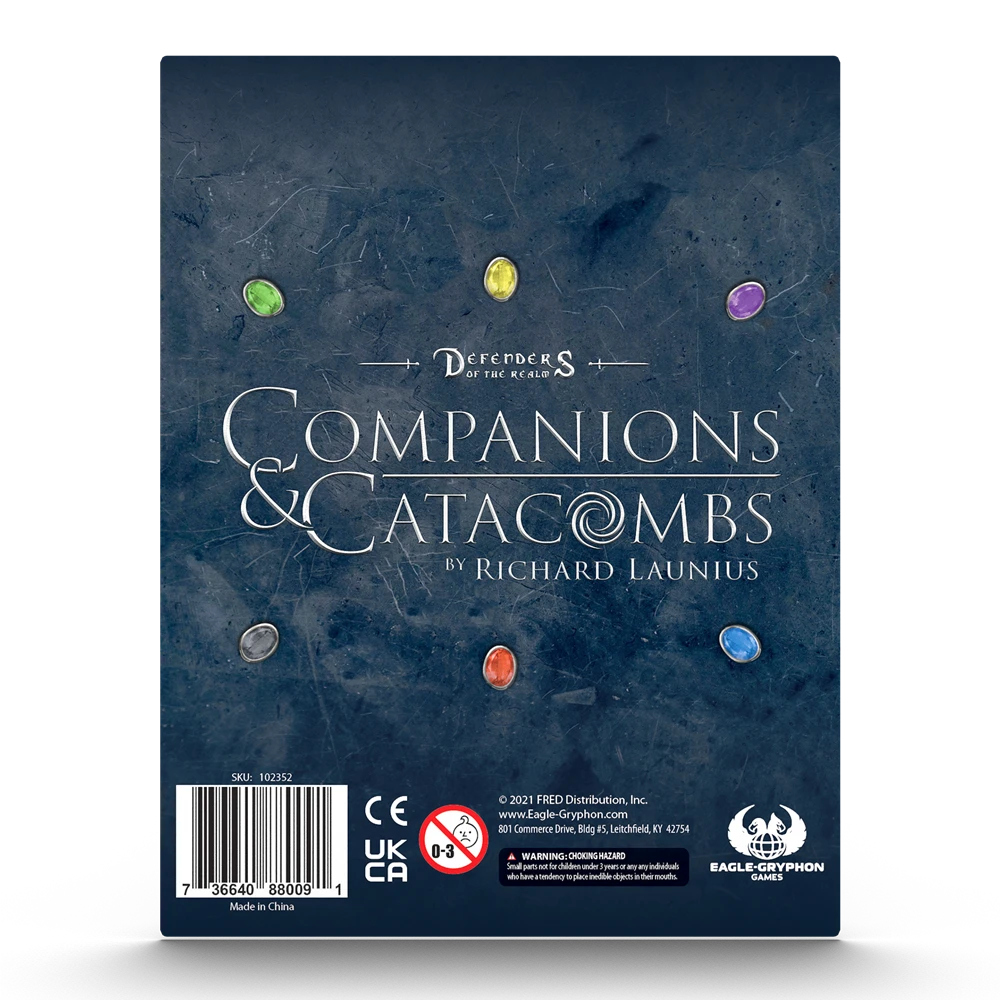 The Companions & Catacombs expansion for Defenders of the Realm takes the realm to the next level in regard to questing as heroes can now enter the dangerous dungeon catacombs where great treasure is hidden. Heroes may enhance their combat abilities by obtaining this treasure, but beware; only the bravest and most valiant heroes can gain such hidden and guarded treasures, and many that seek them may not return. Fear not brave Heroes because you will not be alone in these new challenges for new allies come to your aid, companions that join in your battles and venture with you in the quest for treasure in defense of the realm. But darkness has a way of expanding as well. The enemy grows off the dark places and rises up in opposition of the heroes seeking treasure and allies. They too recruit from the dungeons, and send new challenges the heroes must face in the form of Spies, Renegade Trolls, and brutal Warlords joining their forces. Companions and Catacombs may be added to any game of Defenders of the Realm to expand story and provide new opportunities and challenges for the heroes.