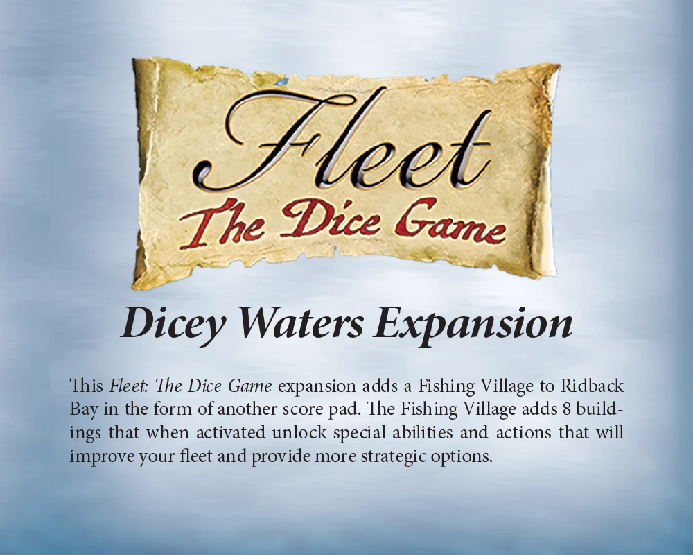 Fleet: The Dice Game – Dicey Waters Expansion adds a new full color mini-scorepad to the game with 8 new buildings in a fishing village. Each building offers a new advantage or tactic, but the only way to check a box in the fishing village is by using any die as a coin and not using the die face i.e. “passing”.