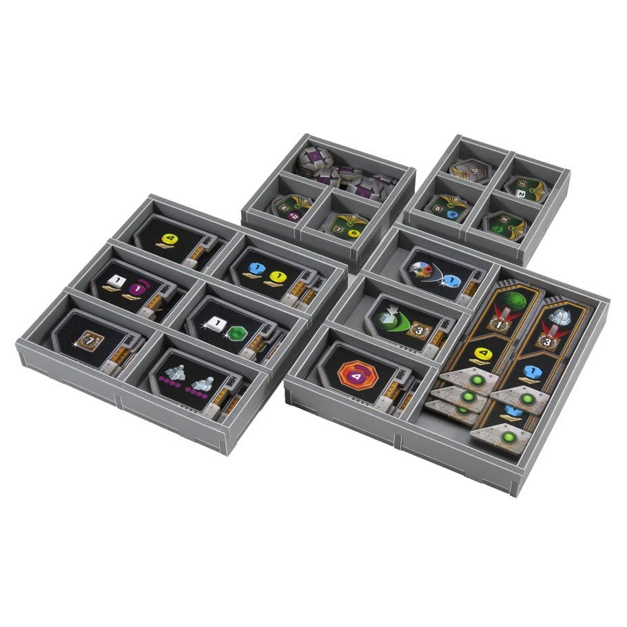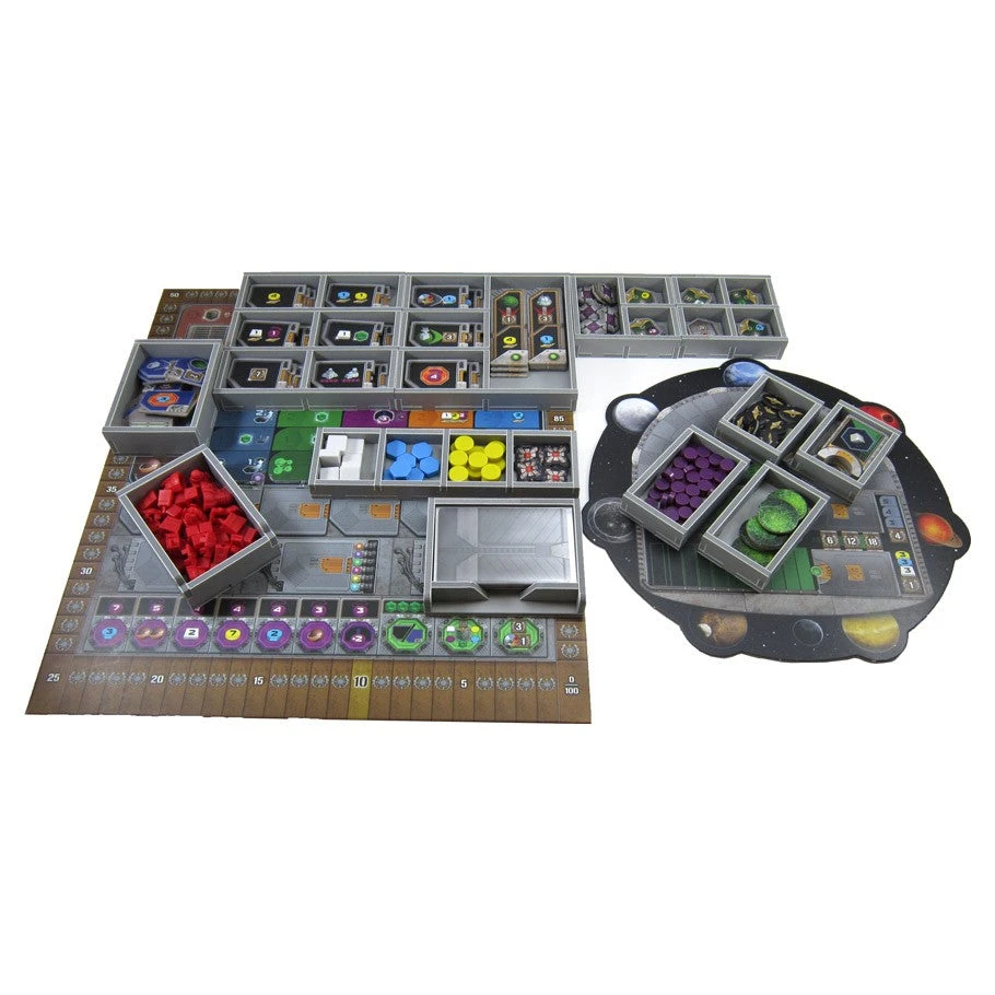 Insert compatible with Gaia Project®. The design provides both efficient storage and improved game play. The trays can be utilized during the game, and they greatly aid set-up and clear-away times. The rules and boards act as a lid on top of the trays.