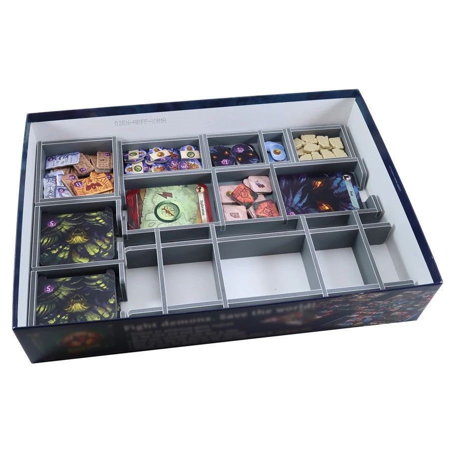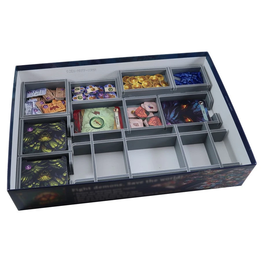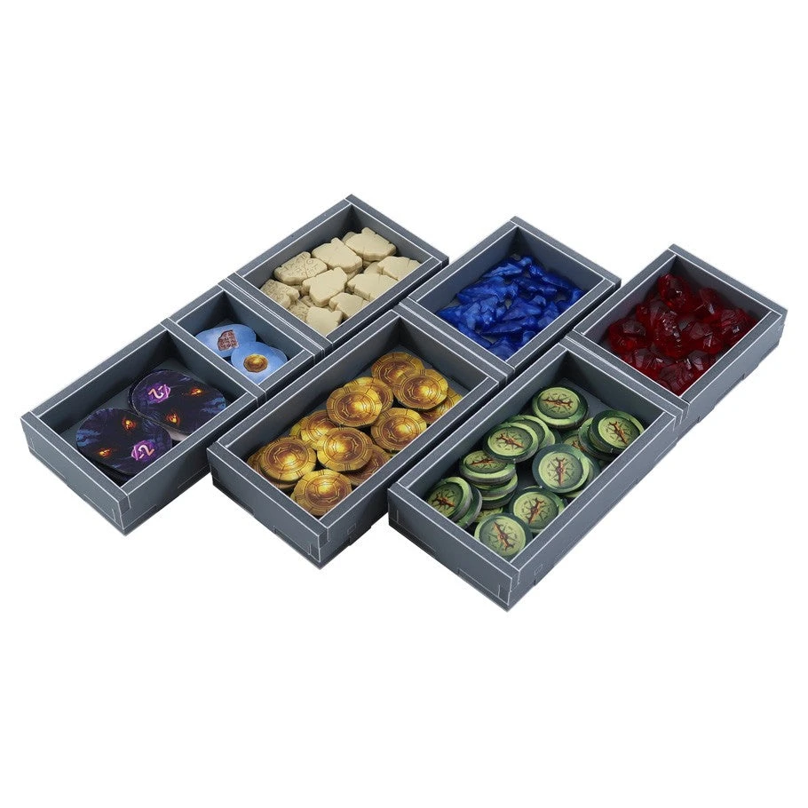 Insert compatible with Lost Ruins of Arnak®. The design provides both efficient storage and improved game play. Many of the trays can be utilized during the game, and they greatly aid set-up and clear-away times.