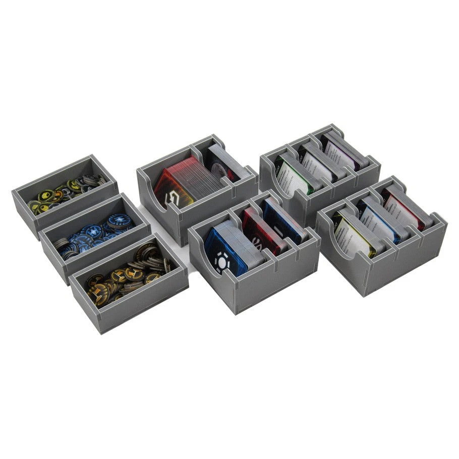 Insert compatible with Twilight Imperium 4th Edition®, and has space provided for future expansions. The design provides both efficient storage and improved game play. Many of the trays can be utilised during the game, and they greatly aid set-up and clear-away times. The rules and boards act as a lid on top of the trays.