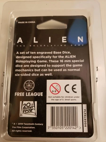 A set of ten engraved Base Dice, designed specifically for the ALIEN Roleplaying Game. These 16 mm special dice are designed to support the game mechanics but can be used as normal six-sided dice as well.