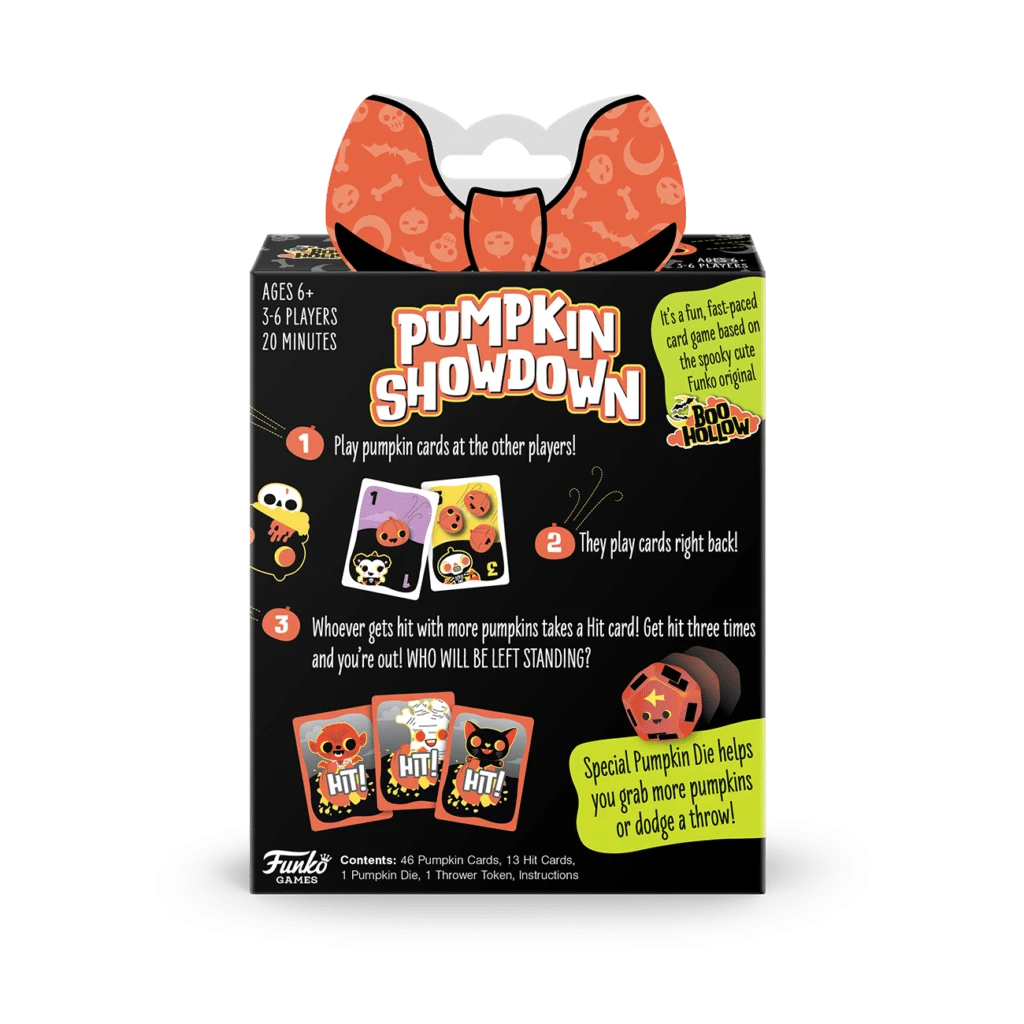 Play Pumpkin cards to throw Pumpkins at the other players, but watch out—they can play cards right back! Roll the special die to grab more Pumpkins, or dodge out of the way at the last second! Whoever gets hit with more Pumpkins takes a Hit card. Get hit three times and your out! Who will be the last one standing?