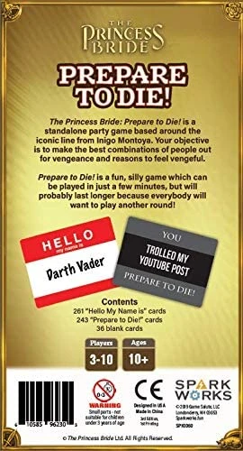 The Princess Bride: Prepare to Die! is a standalone party game based around the iconic line from Inigo Montoya. Your objective is to make the best combinations of people out for vengeance and reasons to feel vengeful.