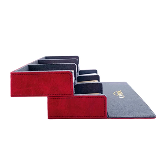 The compartments are designed to hold enough cards for the CATAN base game and 5-6 player extension. The cover of the Trading Post is fully removable and can be easily converted into a rigid dice tray. It is made from premium materials such as Nexofyber and soft inner microfiber lining. This protects the stored cards and provides a smooth sound for dice rolling. Strong magnets will keep this box safely closed, even when it is full.