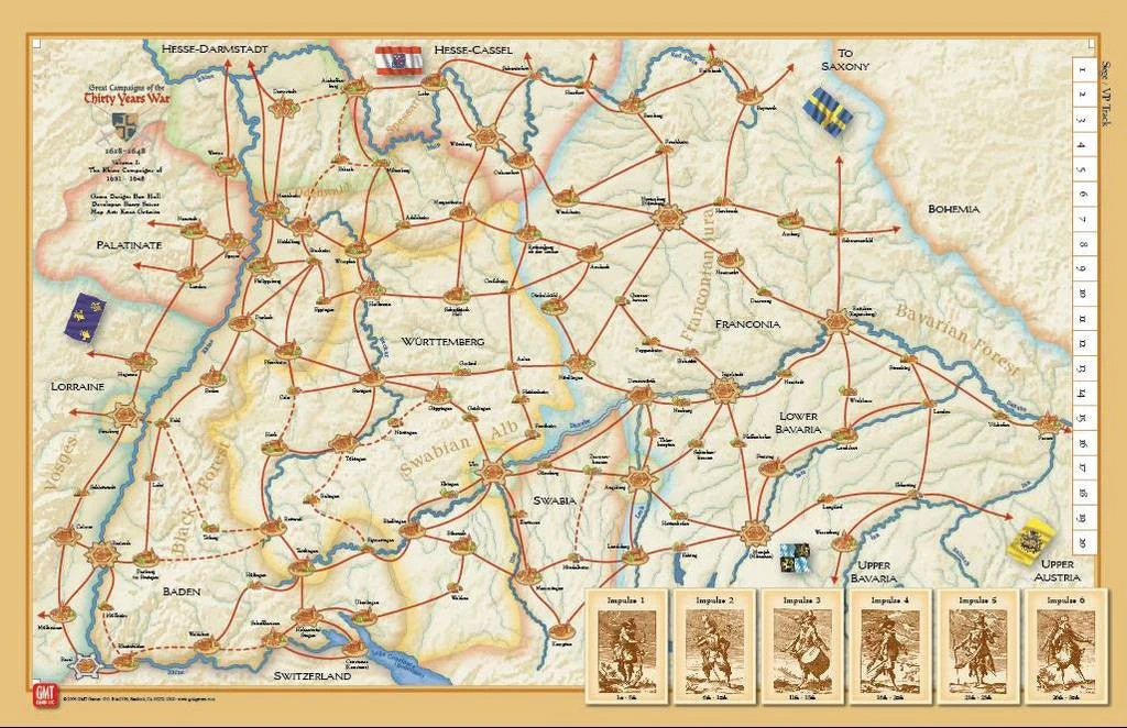 Won by the Sword is the first game in Ben Hull’s Great Campaigns of the Thirty Years War series. It is a two-player game of operational warfare in the 17th Century. Armies maneuver on a point to point map of Southern Germany based on the road network available at the time. Each game is centered around a major battle or full campaign season. A Turn is a month divided into a variable number of impulses. Each army has a hand of Campaign Cards that control the amount of activity it may perform, the supplies it must expend, and a special action. Each impulse features one card play per army. Forces are concealed off map so players are faced with limited knowledge of the enemy. The major activities are maneuver, foraging, besieging fortifications, and an occasional battle. Won by the Sword is a low-complexity game with emphasis on the players maneuvering their forces, but many decisions await. The low rules complexity allows each player, rather than being encumbered with rules, to focus on choices regarding how to manage his campaign.