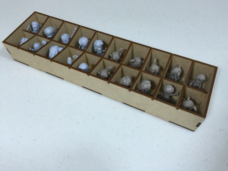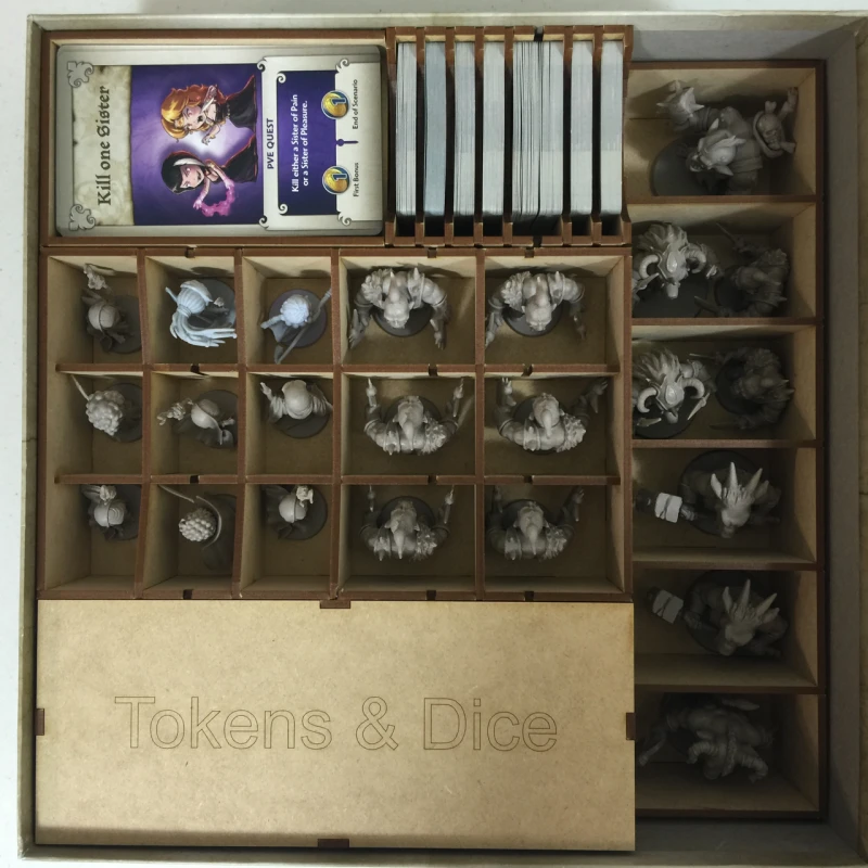 Best of all, everything has a place. We have created a stacked token box that provides a great container to place on the table for setup and for use during play.