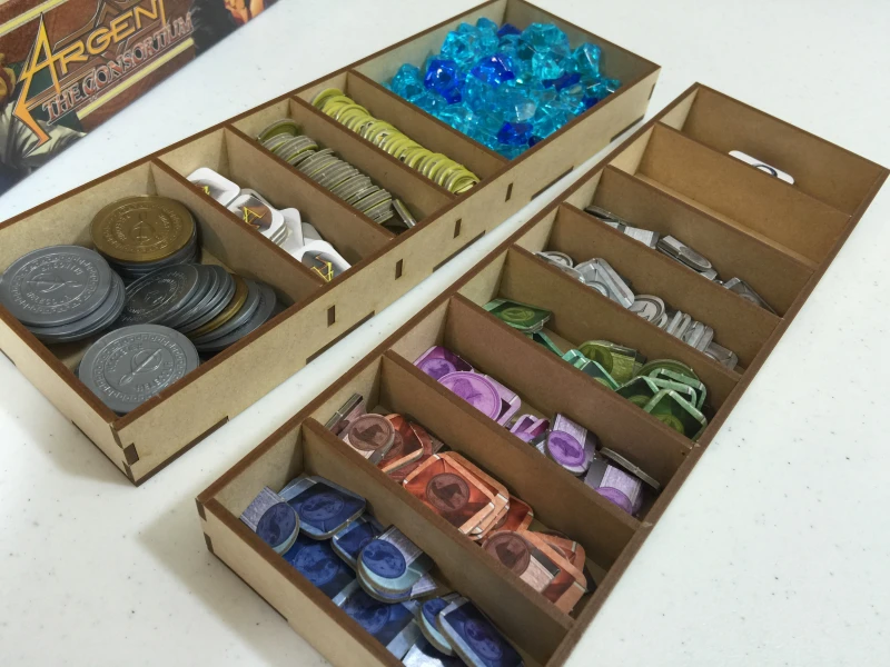Level 99 Games is at it again! Argent: The Consortium is now available and like all great games, it is packed with tokens, bits, and miniatures. Oh yeah, and cards, fistfuls of cards. I don’t know about you, but I can’t name a Level 99 Games release that I don’t like. In fact, I love them all. There is a great starter insert in the box, but I figured we could probably add a little utility with removable trays and organized card storage. This insert will definitely help you get your game underway quickly and breakdown is a breeze too.