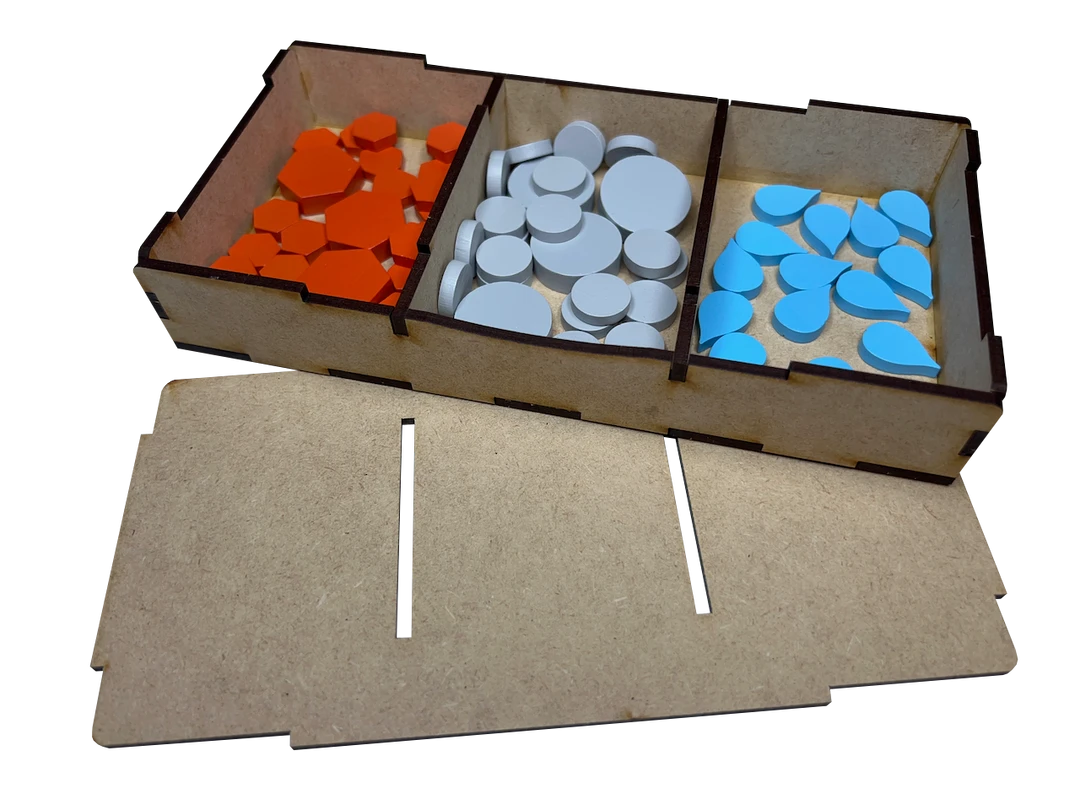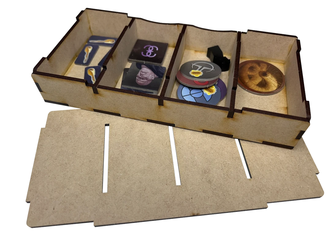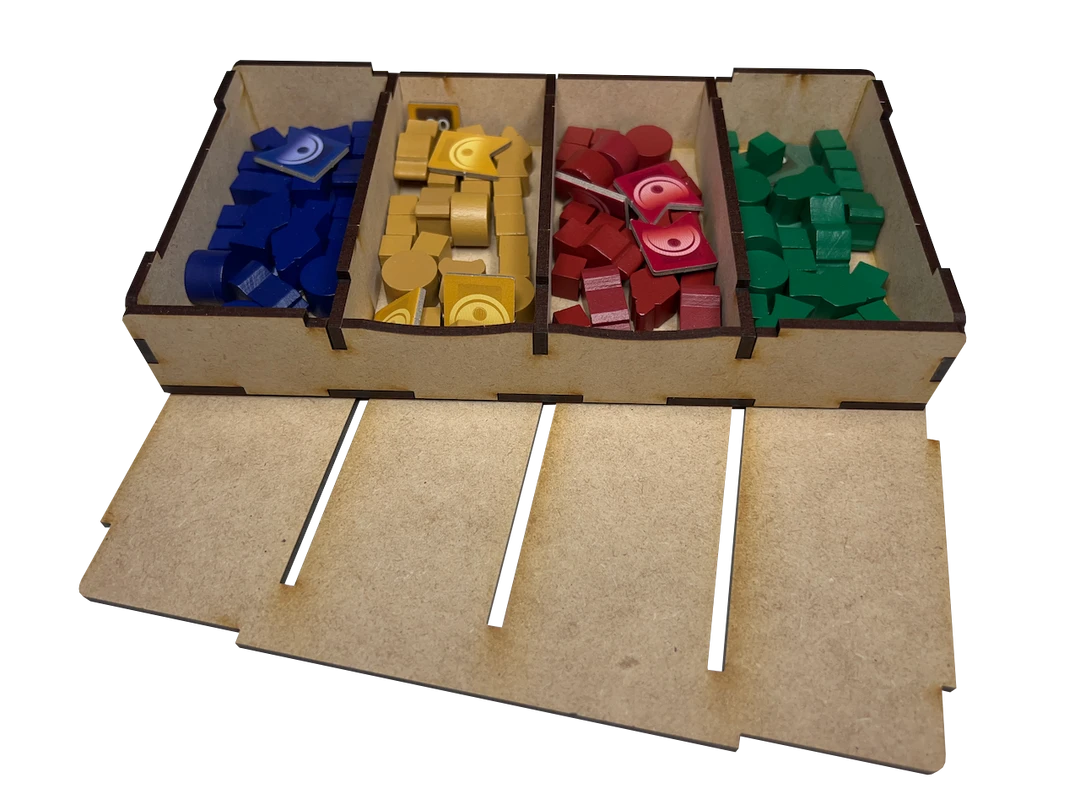- This organizer solution provides five (5) removable trays, four (4) player boards, and one (1) reserve card tray.