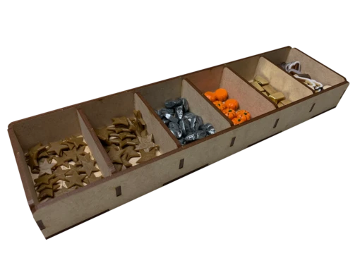 Our storage solution for Dice Settlers (KS, retail) includes six (6) removable trays and is intended to be placed inside the publisher’s game box. This solution speeds setup and breakdown and provides convenient trays for use during play.