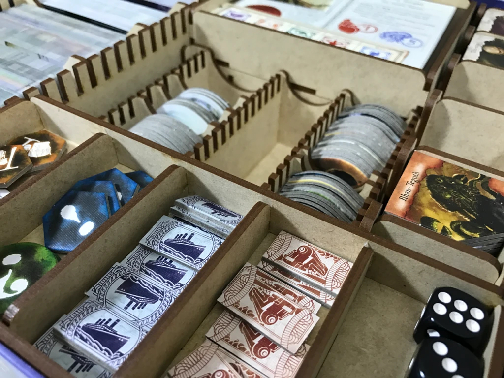Our storage solution for Eldritch Horror includes nine (9) removable trays and is intended to be placed inside the publisher game box (core or any of the large expansion boxes – MOM, UTP, DREAM). This solution will store all tiles, tokens, and many cards from the base game and all expansions (as of January 23, 2017), but you will also need an EH-002 (and possibly 2x EH-002s) to handle the rest of the cards depending upon how many dividers you use.