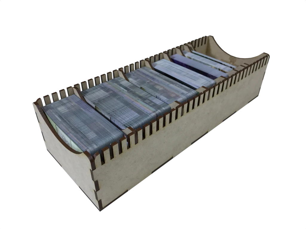 - Small Cards: This insert has 174mm of small card lane storage. It can store ~600 unsleeved cards or ~355 FFG sleeved cards (yellows) (.49mm per card). Keep in mind each divider will also use 3mm of card lane space. The values used for the card thickness estimate = .29mm.