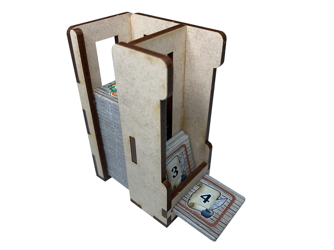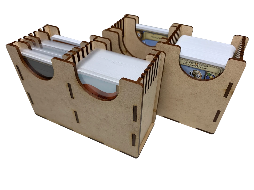 - two (2) large card trays, supporting sleeved or unsleeved cards