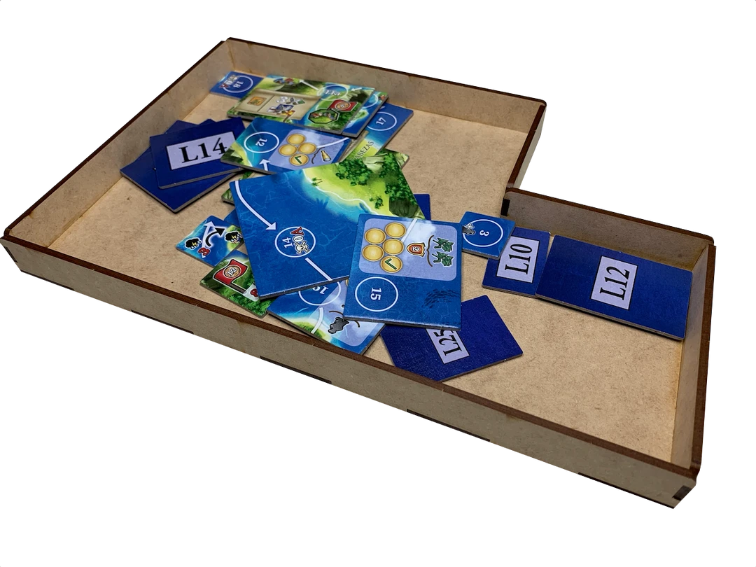 This insert provides an area for storing the game board, game manual, overview cards, and player ship boards on top of the trays.