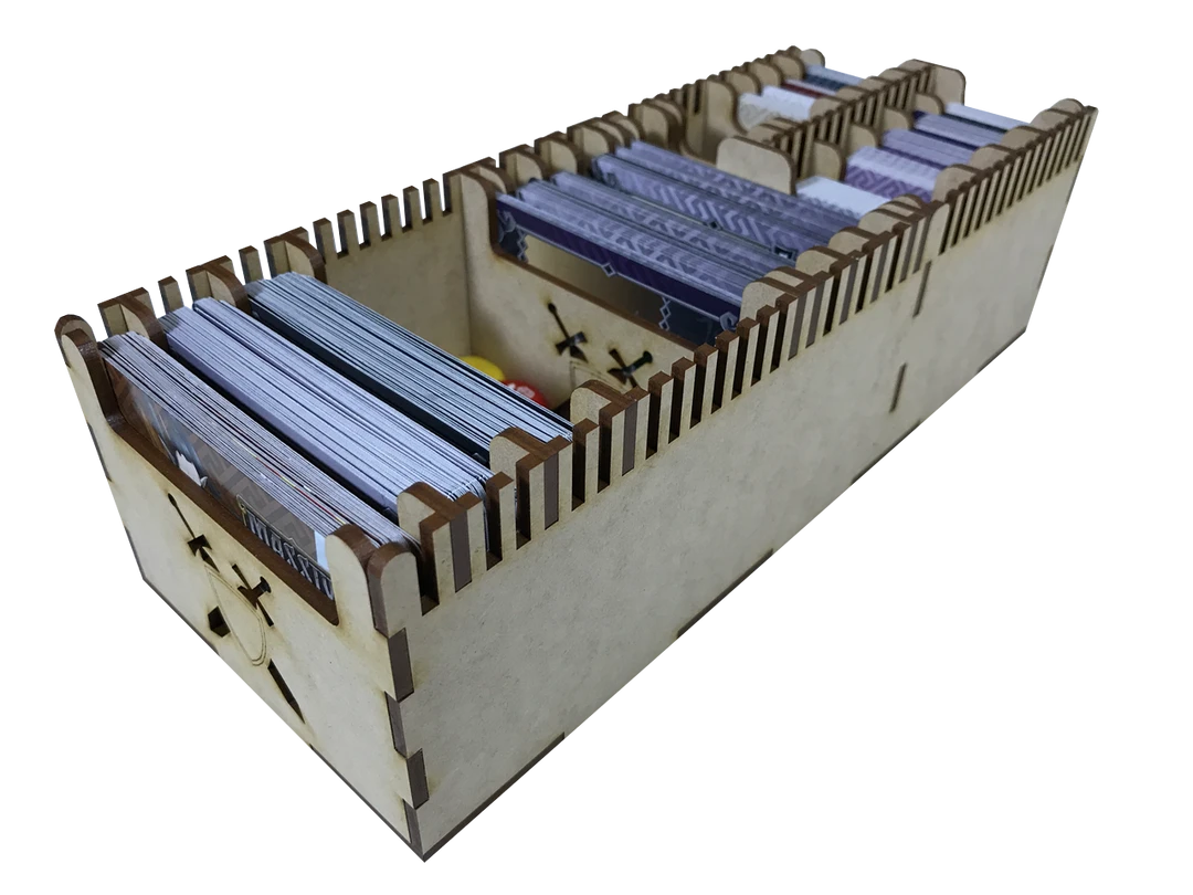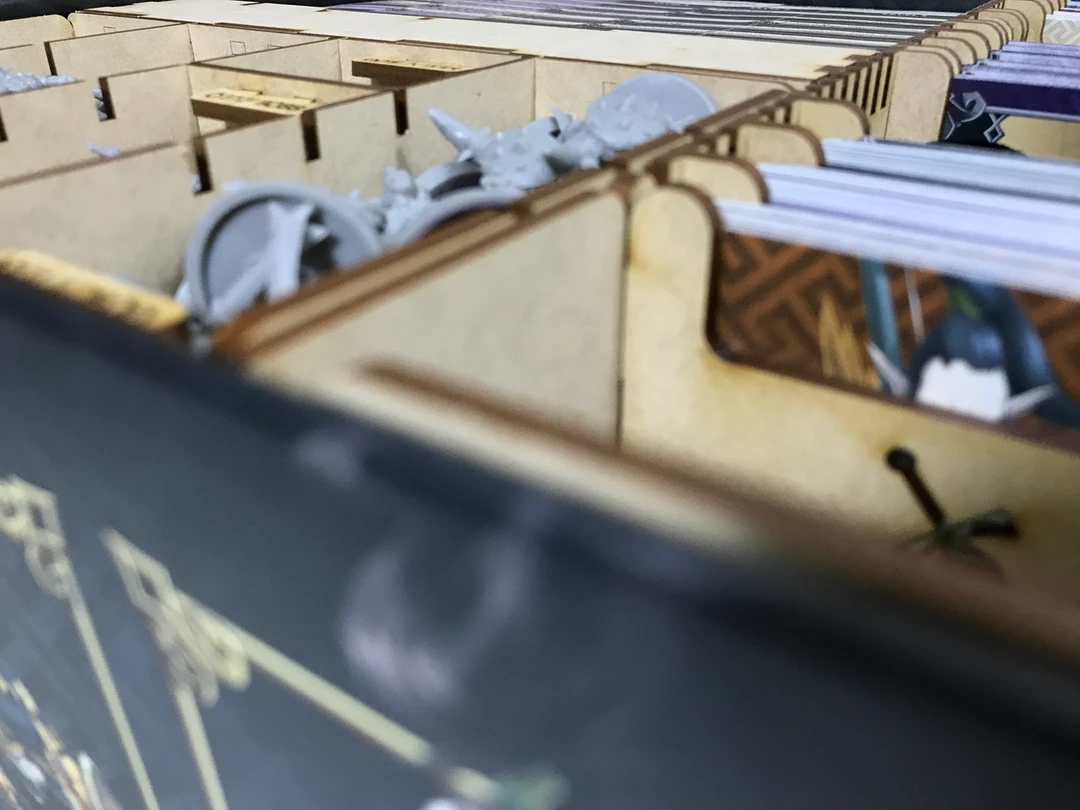 This solution is designed with a rectangle of unused space at the top where you can store your player dashboards and all class pads (add-ons too). This unused space can be filled in using our MD-002 Tray kit, which will offer additional minis storage space in the base box. However, you will then need to store your player dashboards and class pads in one of the smaller add-on boxes.