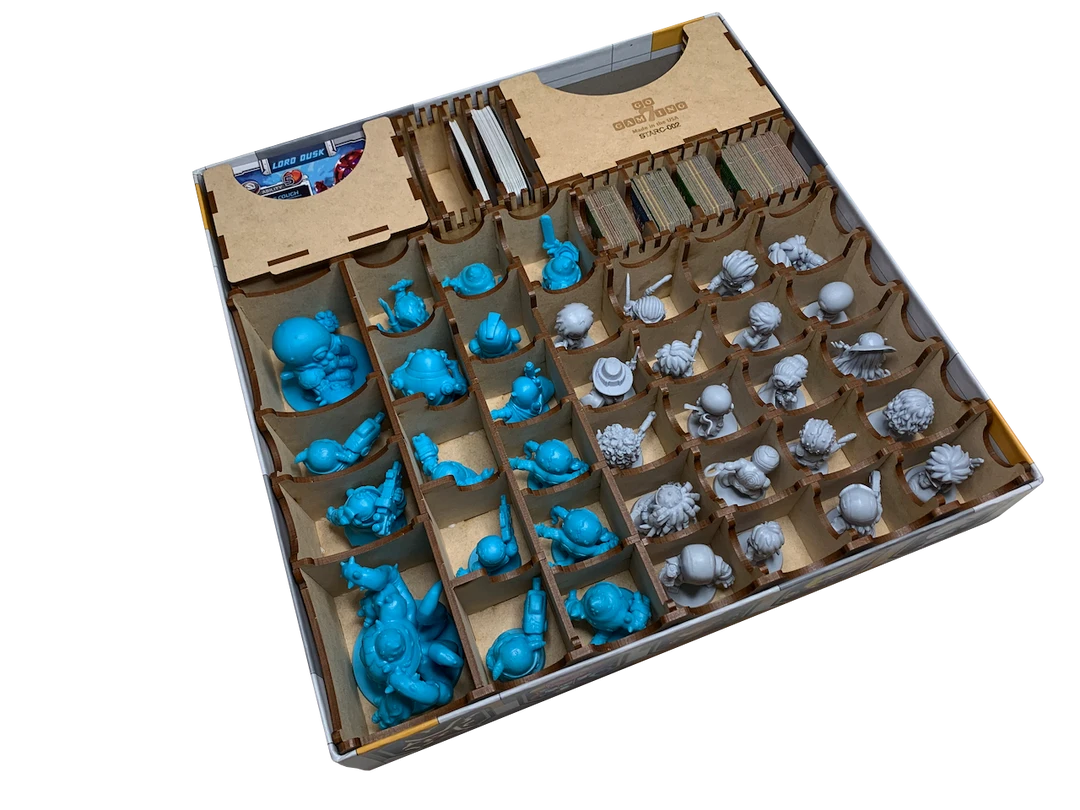 This Go7 Gaming organizer for the Starcadia Quest large expansion boxes provides a storage solution for large/medium/small cards (sleeved/unsleeved), thirty-six (36) minis, 3 campaign pads, and additional upgrade tiles from the various expansions and bonus content.