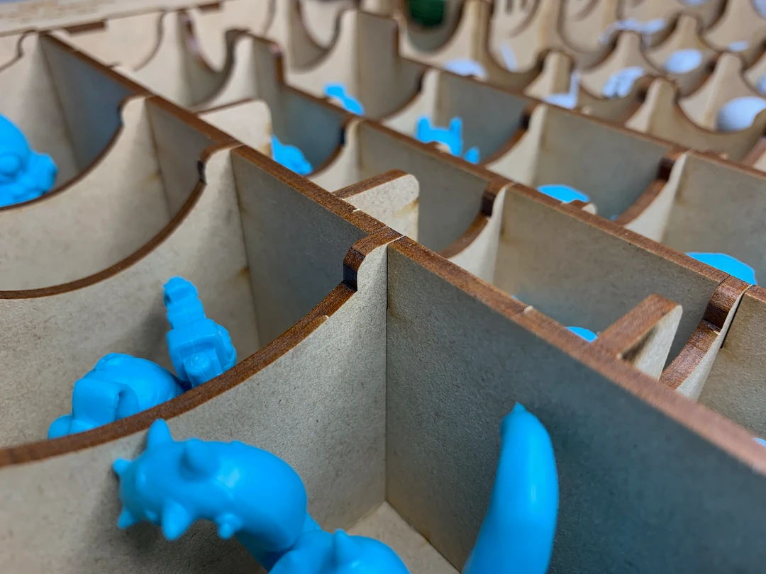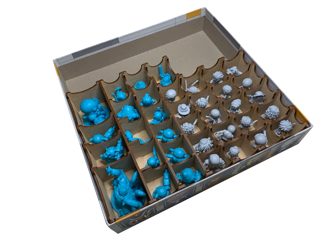 The mini storage provided in this solution includes sixteen (16) compartments for Space Marauders monsters and twenty (20) compartments for heroes.