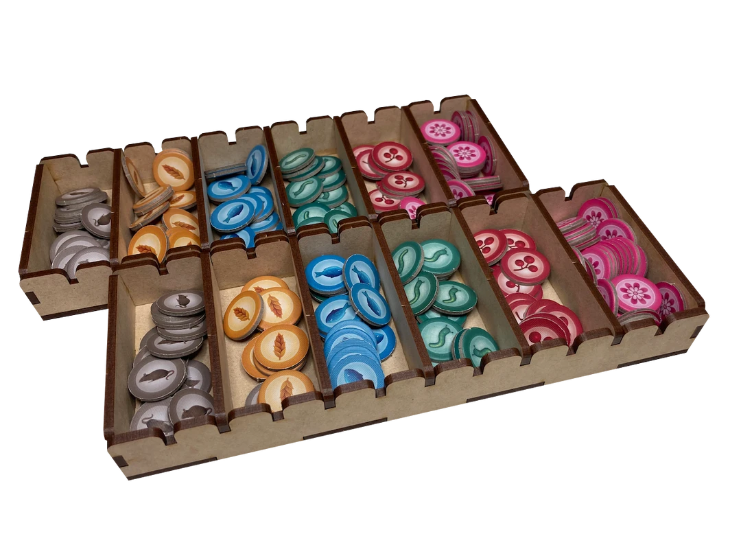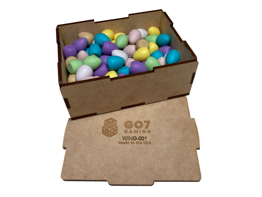The Go7 Gaming organizer for Wingspan + Wingspan: Oceania + Wingspan:European provides room for your cards, tokens, dice, action cubes, food tokens, player boards (single set only), and birdhouse all in a single box! Now you won’t need to cart around two or more boxes to get a game in! Our card trays are designed to replace the plastic lid for card dispensing too!
