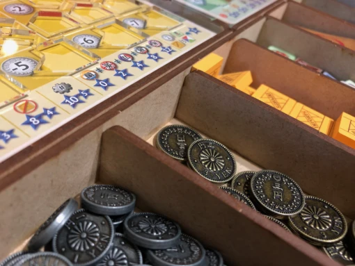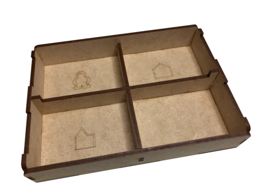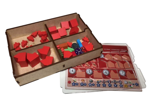 - one (1) top tray that provides storage for all player boards and larger tokens. We provide convenient lift cutouts beneath each compartment for quick removal of components