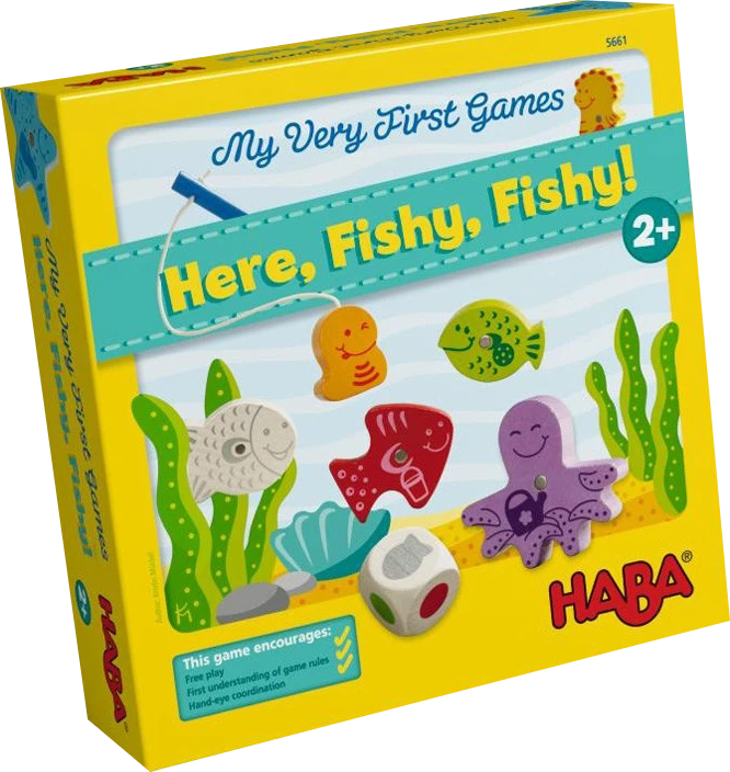 My Very First Games Here, Fishy, Fishy! is a first fishing game for 1-4 children age 2+. The game can be played as free play where a kid tries to catch fishes with a magnetic fishing rod or in a game where a kid tries to catch the fish determined by the color of a die. If successfull the fish rewards the kid with a gift. Who is the best fisherman and collects the different toys first?