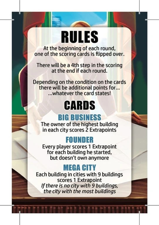This small expansion consists of 10 cards as is for the game Manhattan (1994). An 11th card contains the rules of the game.