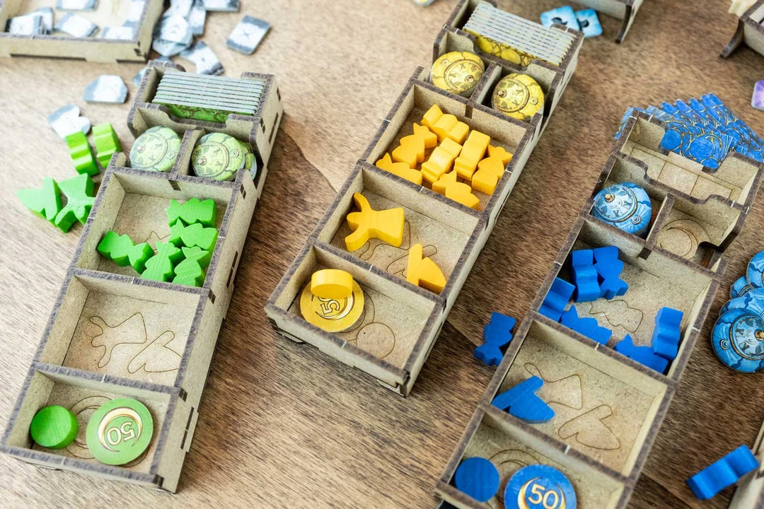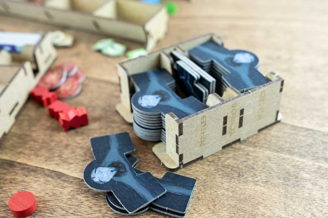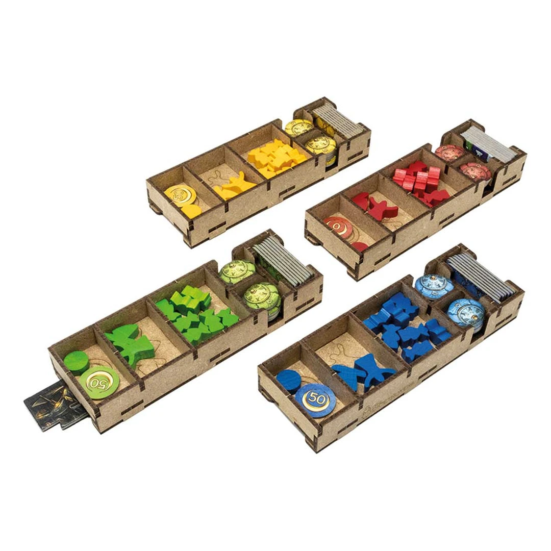 - 4x player set boxes with slots for each piece type. Slot for Starting path token;