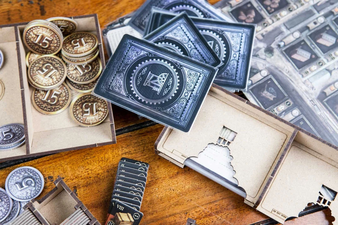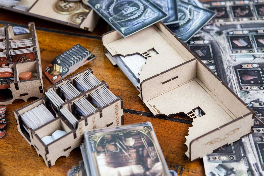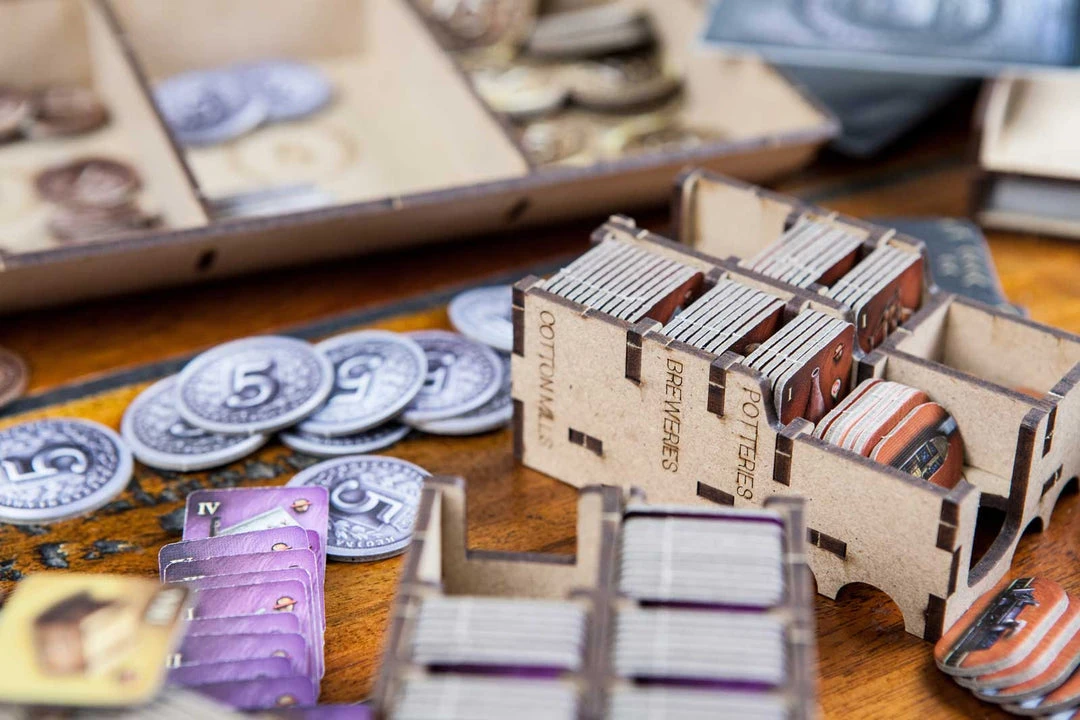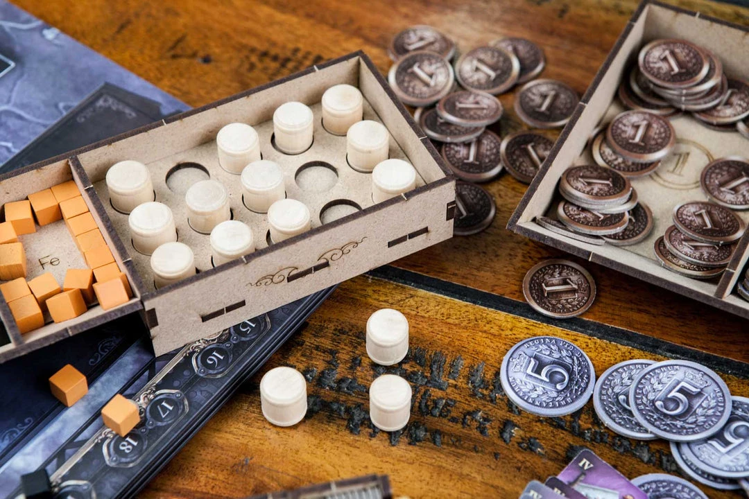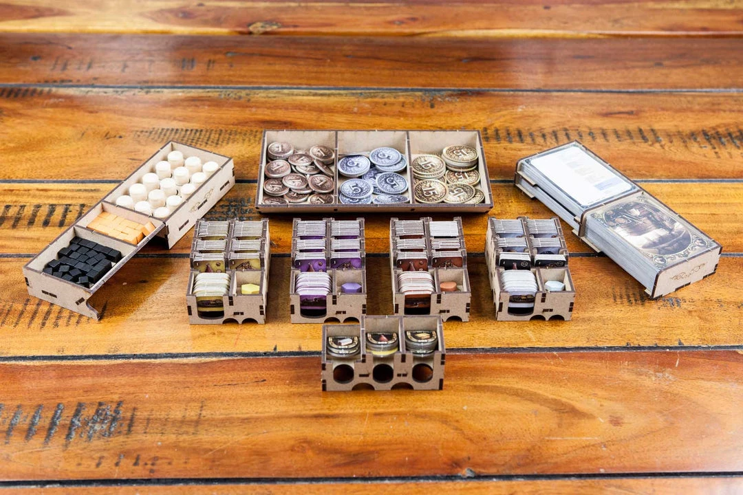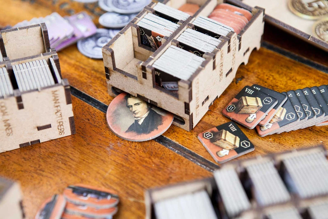 • 4x player set boxes. Slots for buildings divided by type; canals/rails; markers. Bottom slot for character token;