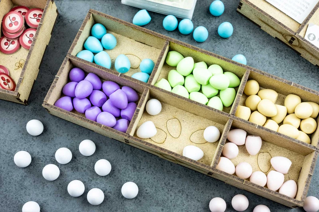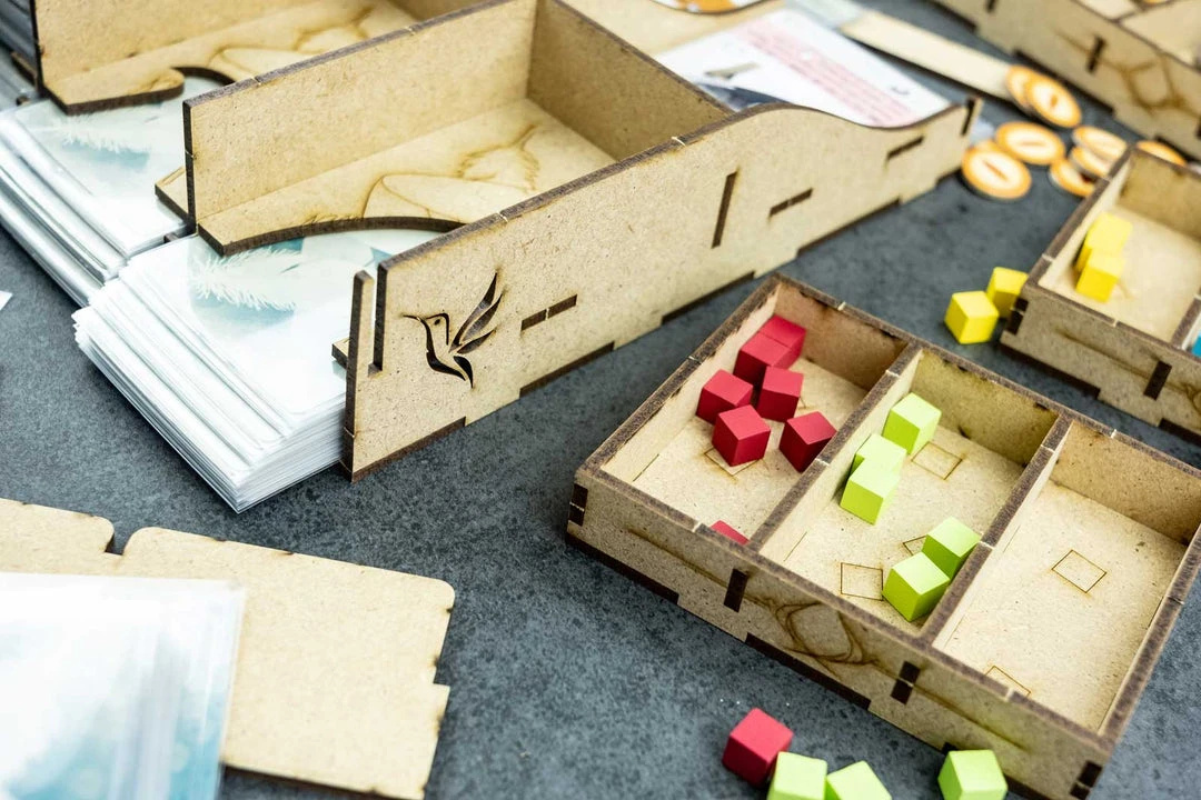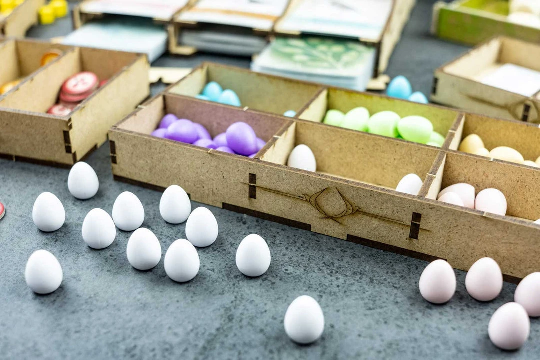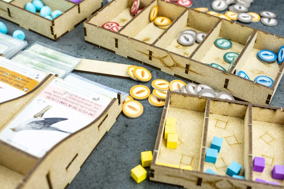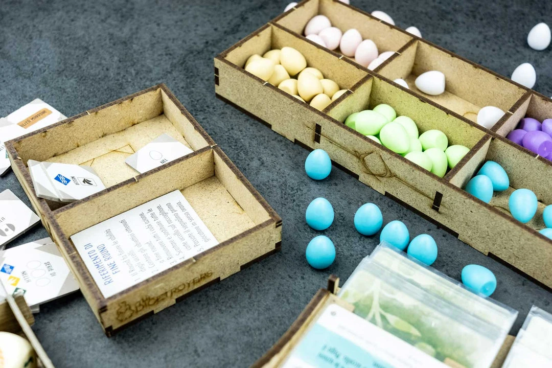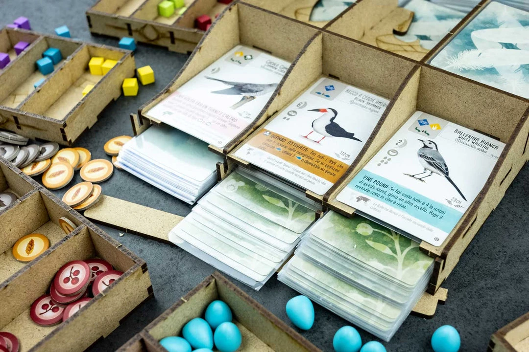 • 1x card holder with slots for bird, objective and automa cards. Further 3 slots for gameplay’s 3 shown birds;