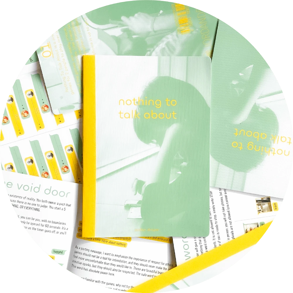 Nothing To Talk About is a zine with 9 games for 2 people to play over any messaging app. All of the games are vastly unique, with a range of styles and mechanics. Use these as an ice breaker, a stress reliever, a creative brainstorming tool, or a way to explore a relationship! Each game encourages play through a ritualized setting. One simply needs to send a photo of a single page of rules to someone on the other end of their phone, and the game begins!