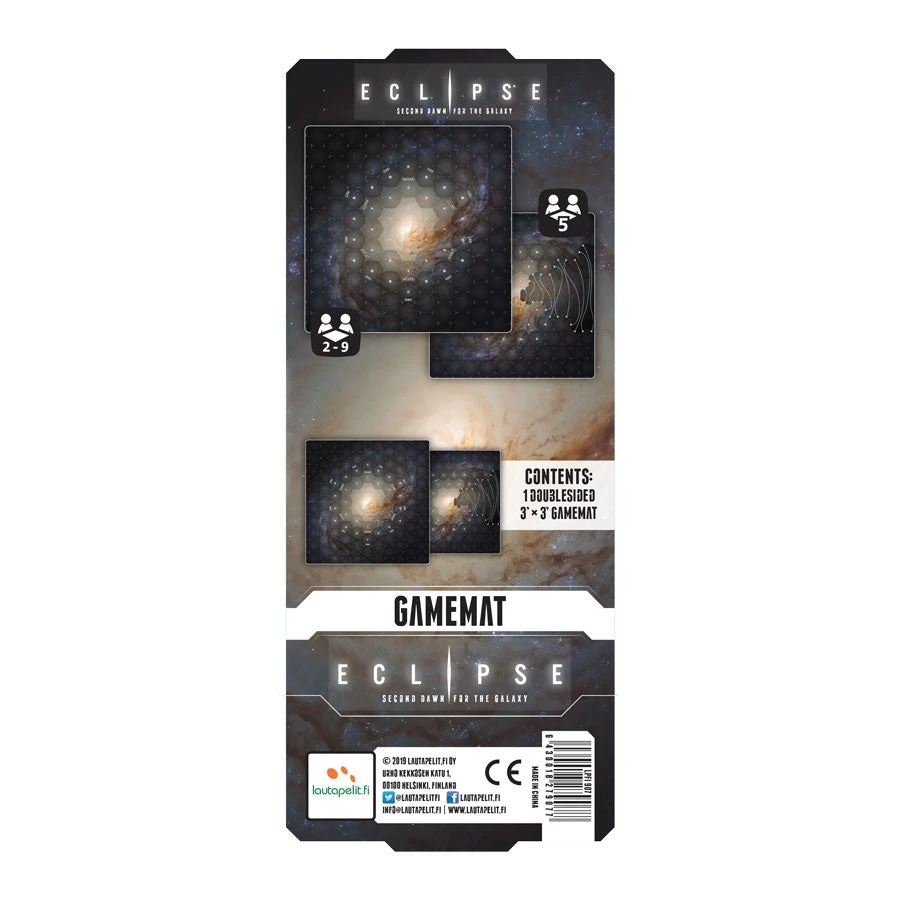 Eclipse – 2nd Dawn: Playmat is a double-sided neoprene playmat for Eclipse – 2nd Dawn for the Galaxy or the original Eclipse boardgame. One side has a regular playing area for 2–9 players, and the other side has a specially designed playing area for a more balanced 5-player game. Also includes a handy carrying bag for the mat.