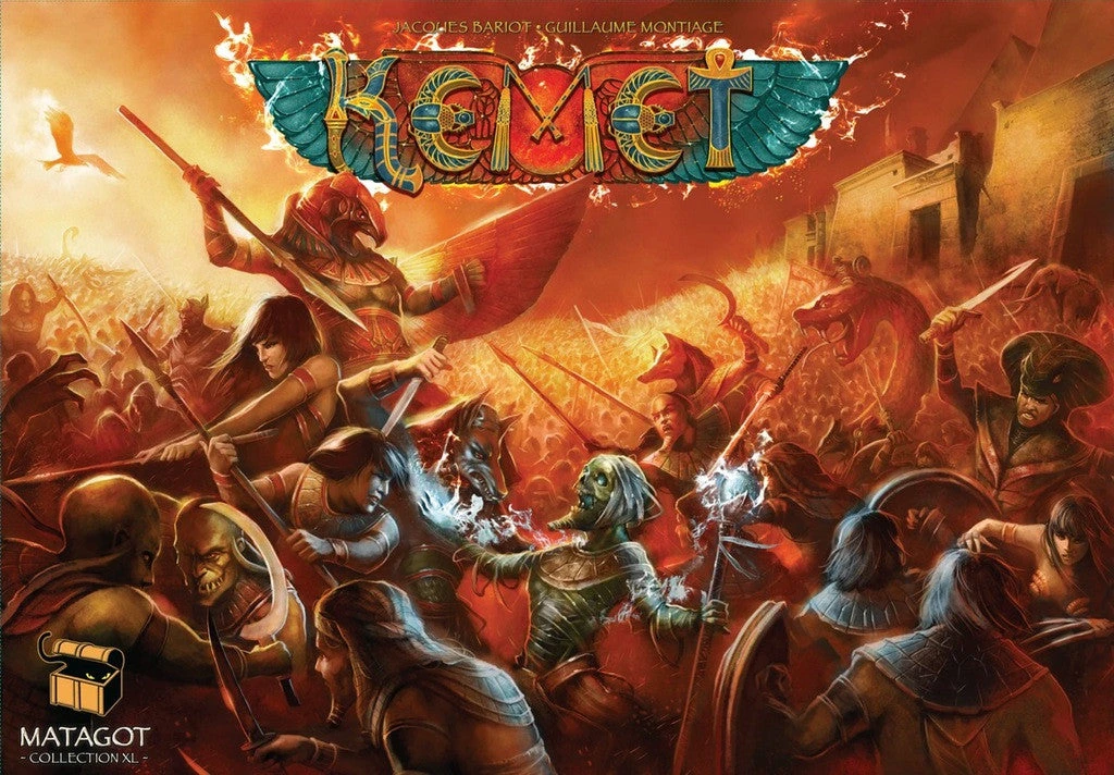 In Kemet, players each deploy the troops of an Egyptian tribe and use the mystical powers of the gods of ancient Egypt – along with their powerful armies – to score points in glorious battles or through invasion of rich territories. A game is typically played to 8 or 10 victory points, which may be accrued through winning attacks, controlling temples, controlling fully-developed pyramids, sacrificing to the gods, and wielding particular magical powers.