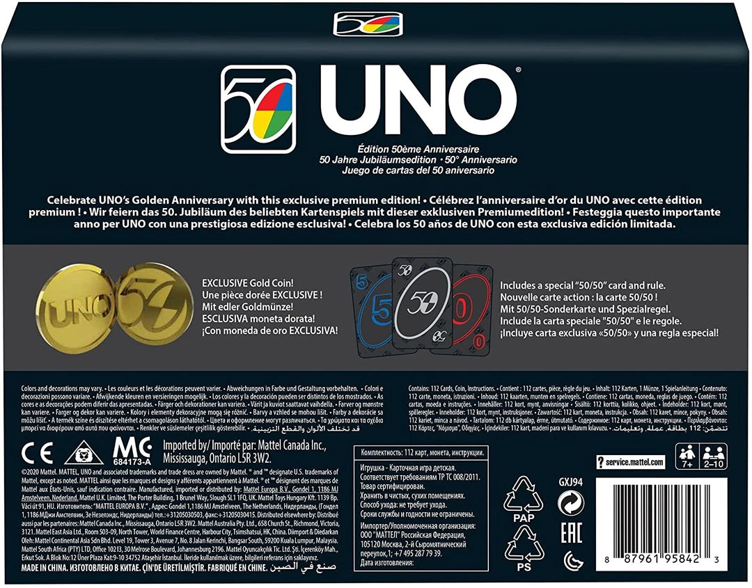 The UNO card game is celebrating 50 years of bringing people together for fast fun and unpredictable twists with this premium Golden Anniversary edition of the classic card game. It arrives in a deluxe, specially designed box and includes cards with a velvety smooth finish. A commemorative golden medallion collector coin is included, and when someone plays the special “50/50” card you flip it to see who will have to draw extra cards. Just like the last 50 years, when a player is down to one card, they must yell “UNO!” Colors and decorations may vary.