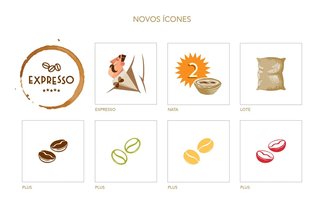 Café expansion with 8 new plan cards and 4 new icons: Expresso, Lote, Nata and Plus.