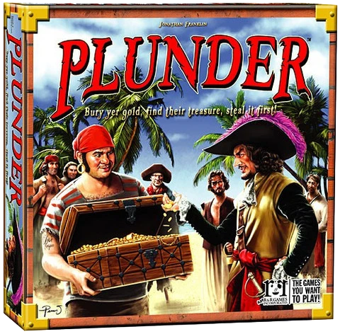 Plunder is a deduction card game in which everyone is a pirate captain with a buried treasure. Players attempt to steal the hidden treasures of the other captains by figuring out the three landmarks that mark where each treasure is hidden. The first player to a treasure takes the largest share, while those who reach it second or third receive less. Keeping your treasure from being stolen is also worth victory points in the end. Find and steal the most treasures first to win in the end!