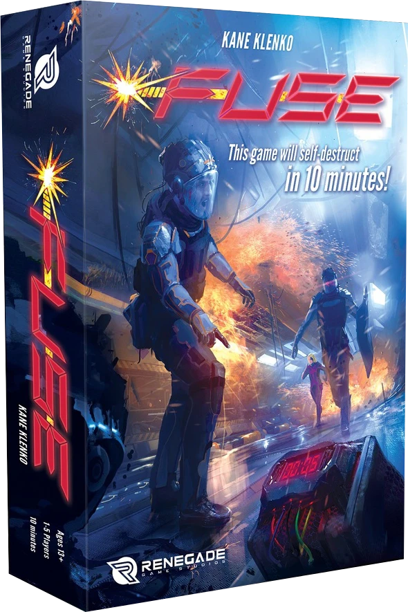 FUSE is a real-time co-operative game that employs 25 dice and 76 cards. Each game is set to a ten minute timer, and players must work together in that ten minutes to defuse all of the bombs. Each bomb is represented by a card which needs a certain combination of dice in order to defuse it. A player will draw a number of dice equal to the number of players out of a bag and roll them. Players must then decide who will get which dice, but each player must take one and only one.