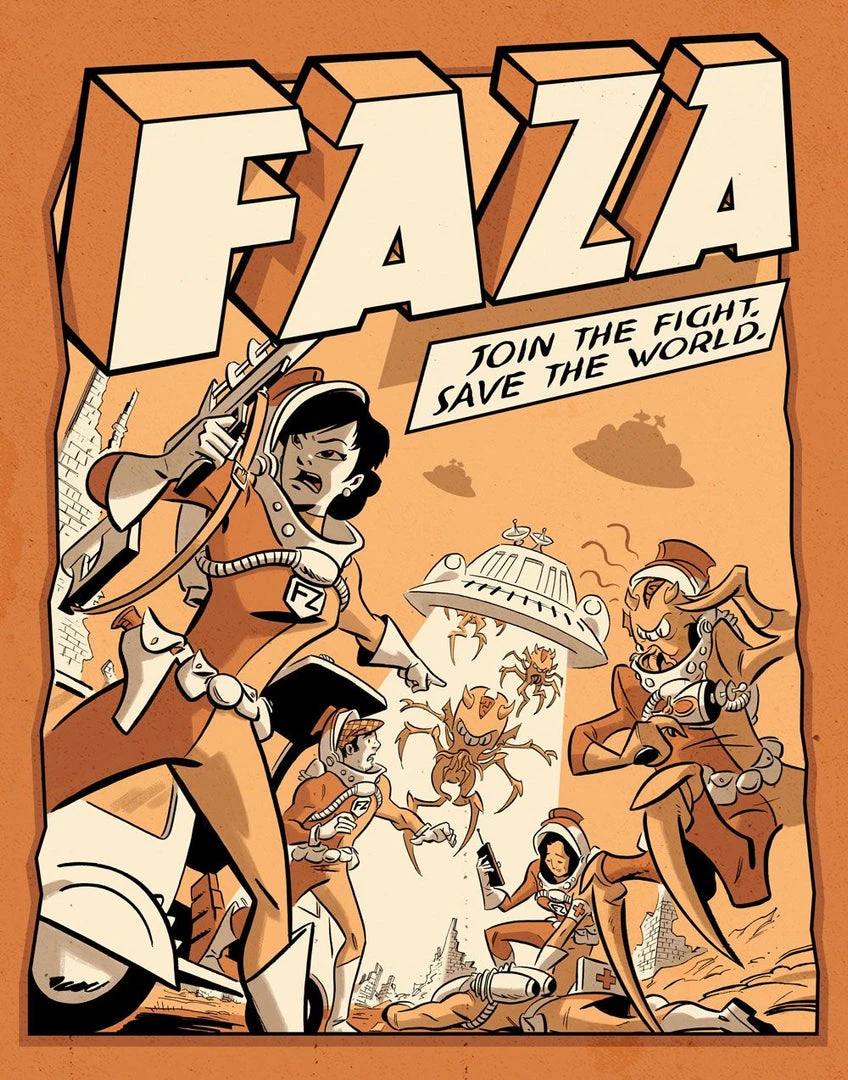 Faza is a cooperative science fiction board game for 1-4 players navigating a post-apocalyptic city. In order to save your city from the Faza, your extraterrestrial occupiers, your team will need to destroy their three motherships.