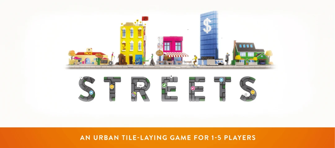 Streets is a tile-laying game where players build a city together. Each building has a simple valuation formula which earns money for the owner when the street is scored. Valuations are affected by the other buildings in the street, so smart placement is essential to maximise profit. On top of this, the city is populated by hipsters, families, shoppers and tourists, each with their own preferred building type. Cleverly located properties can benefit from the growing crowds of people who further increase the value of the buildings they visit.