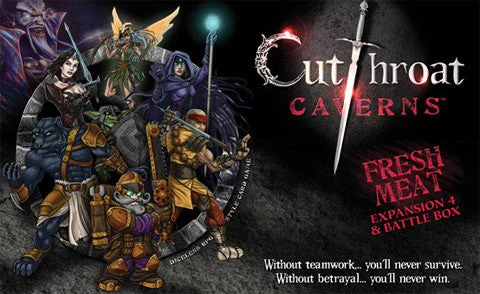 Fresh Meat, the long-anticipated fourth expansion to Cutthroat Caverns, is truly an expansion “of the fans, for the fans” as it includes everything players have been begging us for, including 12 unique pre-generated characters, 34 Reputation cards that can be used to custom create your own unique characters, 13 new cards for the main deck (a first), 23 nasty new Encounters (the most offered in any expansion to date, many of which were inspired by fans in our “Create an Encounter” contest) 7 new Events, 12 new Relics, a new custom character mechanism, and a giant Battle Box in which to store your entire Cutthroat Caverns collection.
