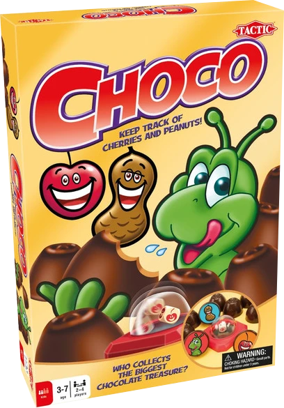 A childrens’ game where two players take turns picking one of many (plastic) chocolate-covered candies hoping not to find “the critter in the candy.” Before the game, all of the candies are turned right-side up and mixed around randomly. All of the candies have a picture of a cherry or a peanut on the bottom, except for one. One of the candies has a bug (the “Critter”). Each player in turn pops the “Pop-O-Matic” and then tries to select a matching candy (either peanut or a cherry). If you select the correct type, you keep it. If you select the other type, you put it back. If you select the critter, you return one of your chocolates to the pile, in addition to returning the critter. At the end of the game, when the critter is the only candy left, the player with the most chocolates wins.