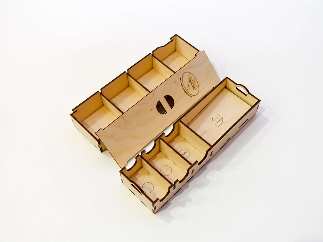 One token tray has a removable lid while the other features engravings on the bottom to help organize your tokens and cubes.