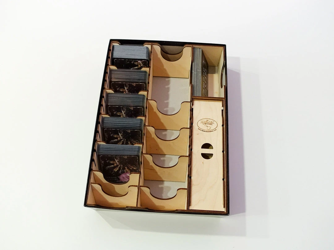 Our Among the Stars Organizer features two removable trays and plenty of card storage. Â It supports all existing expansions with plenty of room for growth. Â Like all of our organizers, it supports sleeved cards and comes with 8 adjustable dividers. Â Cards are stored at an angle to support even the largest card sleeves in the existing game box. Â Works great with Fantasy Flight FFS65 square card sleeves.
