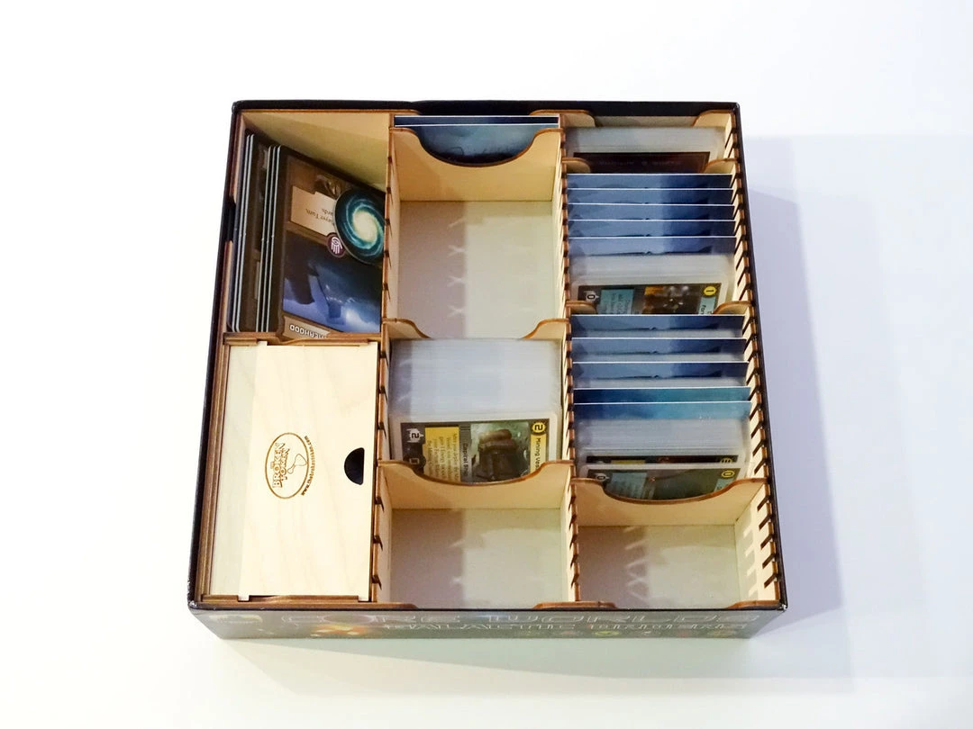 Our Galactic Core Organizer is compatible with Core Worlds by Stronghold Games. This organizer is designed to fit inside of the Galactic Orders game box and will support the base game, Galactic Orders and Revolution with plenty of room to spare for future expansions. All game pieces are contained within two removable trays making setup a breeze. The two card lanes are wide enough for sleeved cards and we include 6 adjustable dividers.