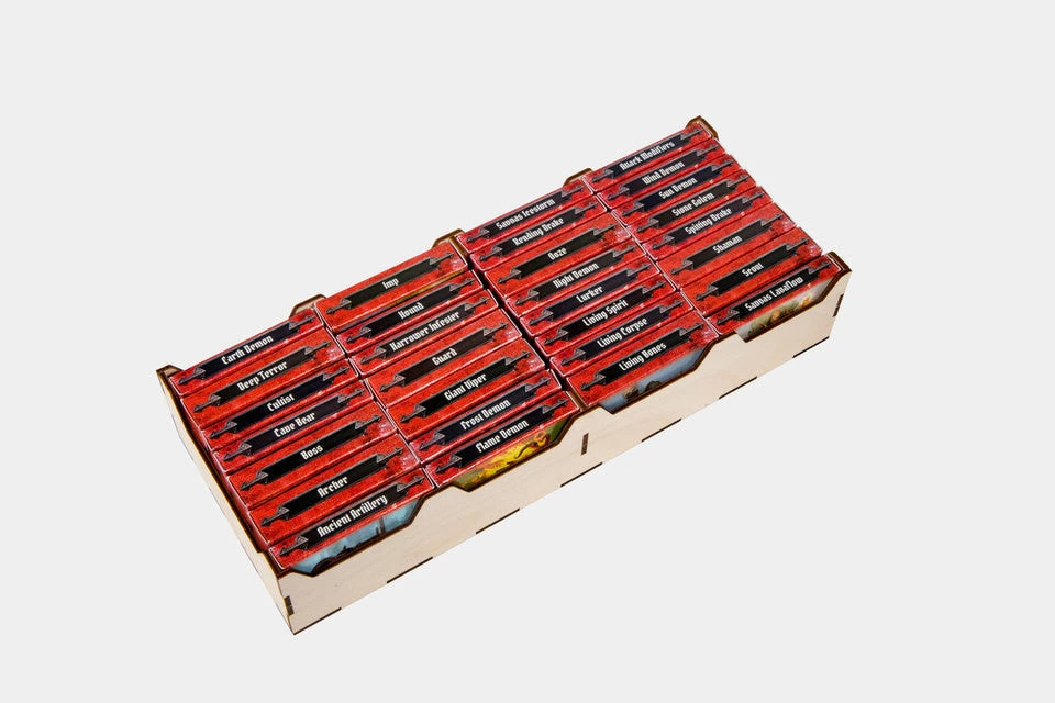 17 removable trays make set-up and tear down a breeze. A large tray holds all the 2-sided map tiles with an etched stacking order to help find the right tiles and pack back up. 4 identical trays hold the party’s active character’s ability cards, attack modifier cards, collected item cards, character tokens, character pad, character board and hp/xp dials and trackers, as well as a spot for the character standee for first edition copies of the game. The miniatures tray holds all the character miniature boxes with cutouts making it easy to remove the right one. 2 identical trays hold the 2-sided overlay tiles with a third smaller tray for the trap overlay tiles. 1 mini-card tray holds the 4 base attack modifier decks, blessing cards, curse cards, negative modifiers, battle goal cards, random scenario cards, and all item cards with enough dividers to separate all the cards by type and items by prosperity level. The standard card tray holds road and city events; separated by available, locked and used events; personal quest cards, and both types of random dungeon cards. The standard card tray also has a “secret compartment” under the cards for the Town Records Book and sealed envelopes. There are 3 “combat” trays, one holds all the status tokens, one holds damage tokens, money tokens, xp tokens/scenario aid tokens, and element discs and round tracker for set-up, the third tray holds the summons and their trackers and number tokens. Finally there are 3 monster trays, one for plastic stands, another for the monster stat sheets and sleeves, the third holds 30 custom full color tuck-boxes that store the monster attack modifier cards and each monster type’s standees and ability cards together.