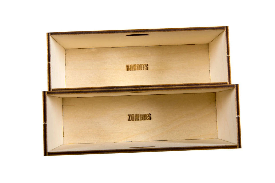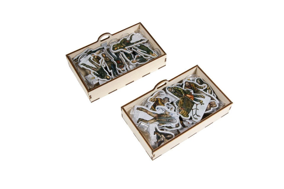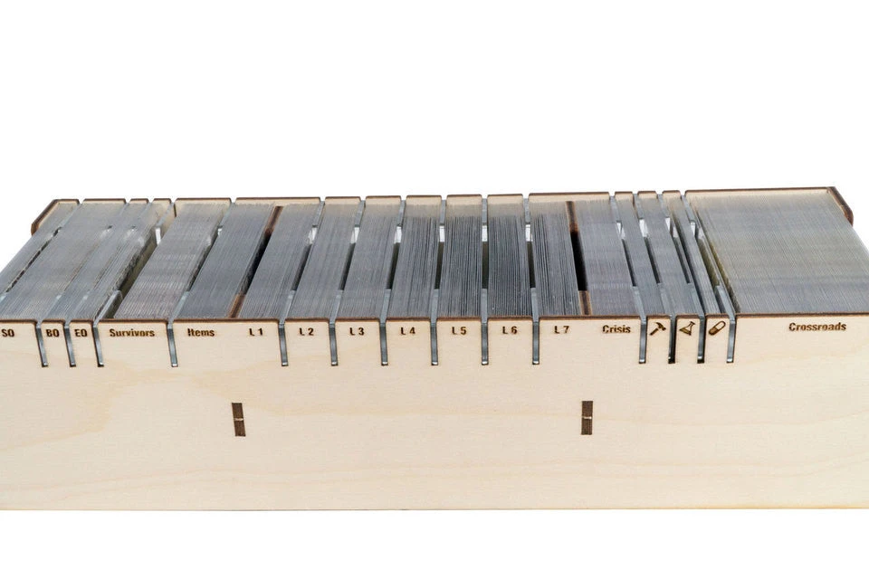 You’ve survived the initial winter, but now darkness has fallen and dawn is nowhere in sight! Here to help you survive is our Long Winter Organizer, specifically designed to bring order to your Dead of Winter®: The Long Night box. Cards are neatly organized into designated sections with removable dividers, and supports sleeves. Your colony characters are safely separated from zombies, experiments and bandits with four removable standee trays. Two removable token trays contain your dice, tokens and extra stands. And start the night in style with our exclusive wooden “start player” knife token.