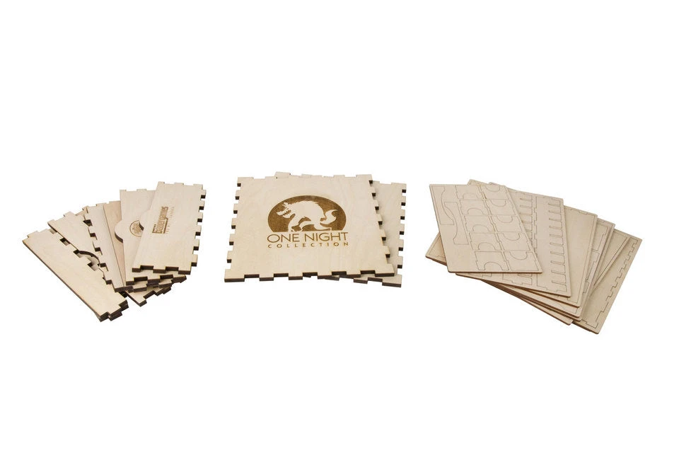 Your One Night Ultimate Collection deserves the ultimate storage crate solution! The officially licensed Broken Token One Night Ultimate Collection Game Crate stores and organizes One Night Ultimate Werewolf, Daybreak, Vampire, Alien and bonus packs in an attractive wooden case. Features a removable token tray, supports sleeved cards, and includes 16 adjustable dividers